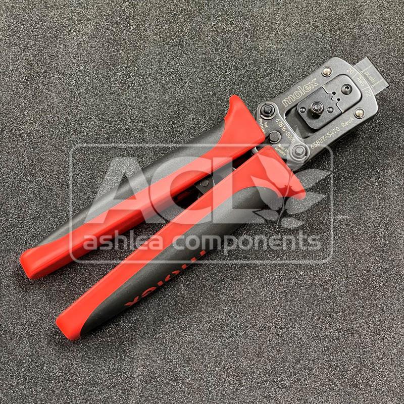 The 63827-5400 is a hand crimping tool manufactured by MOLEX. This tool is designed for terminating wires within a 20 to 22 AWG (American Wire Gauge) range. It provides a reliable and consistent crimp connection for various electrical applications. The hand-operated design allows for portable use and controlled crimping force.